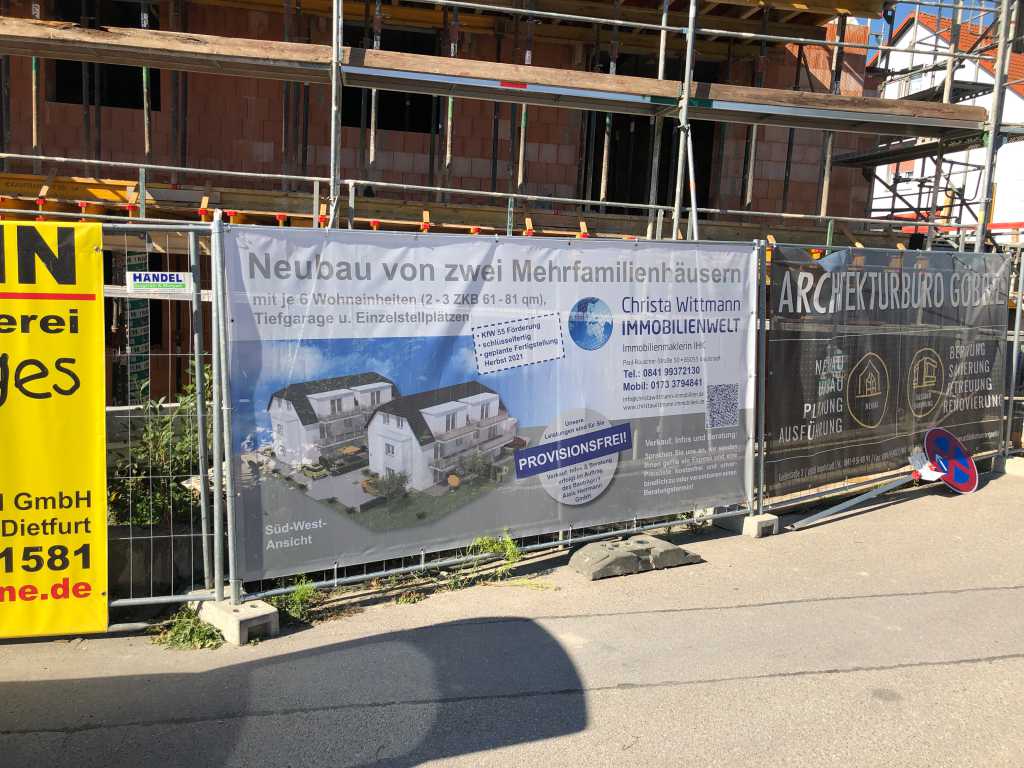 Robuste Werbebanner für den Einsatz am Bauzaun, wahlweise aus PVC oder luftdurchlässigem Mesh-Gewebe.