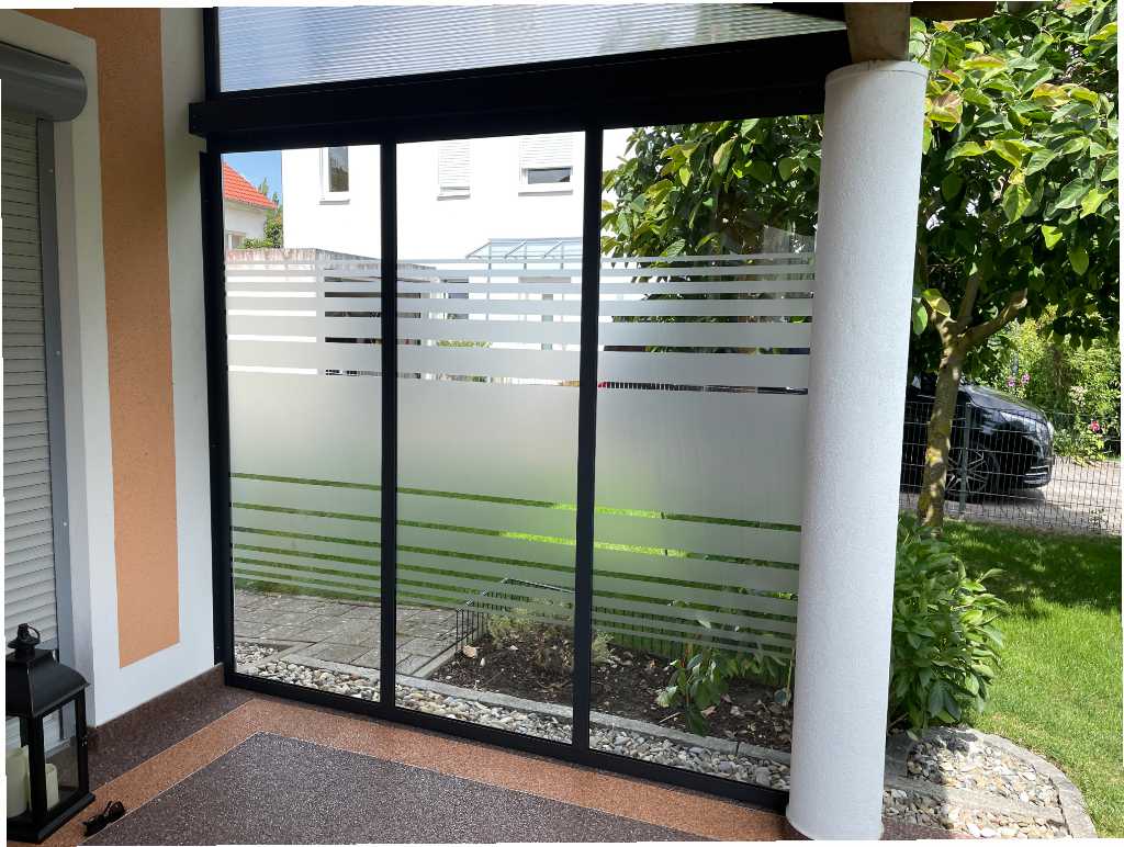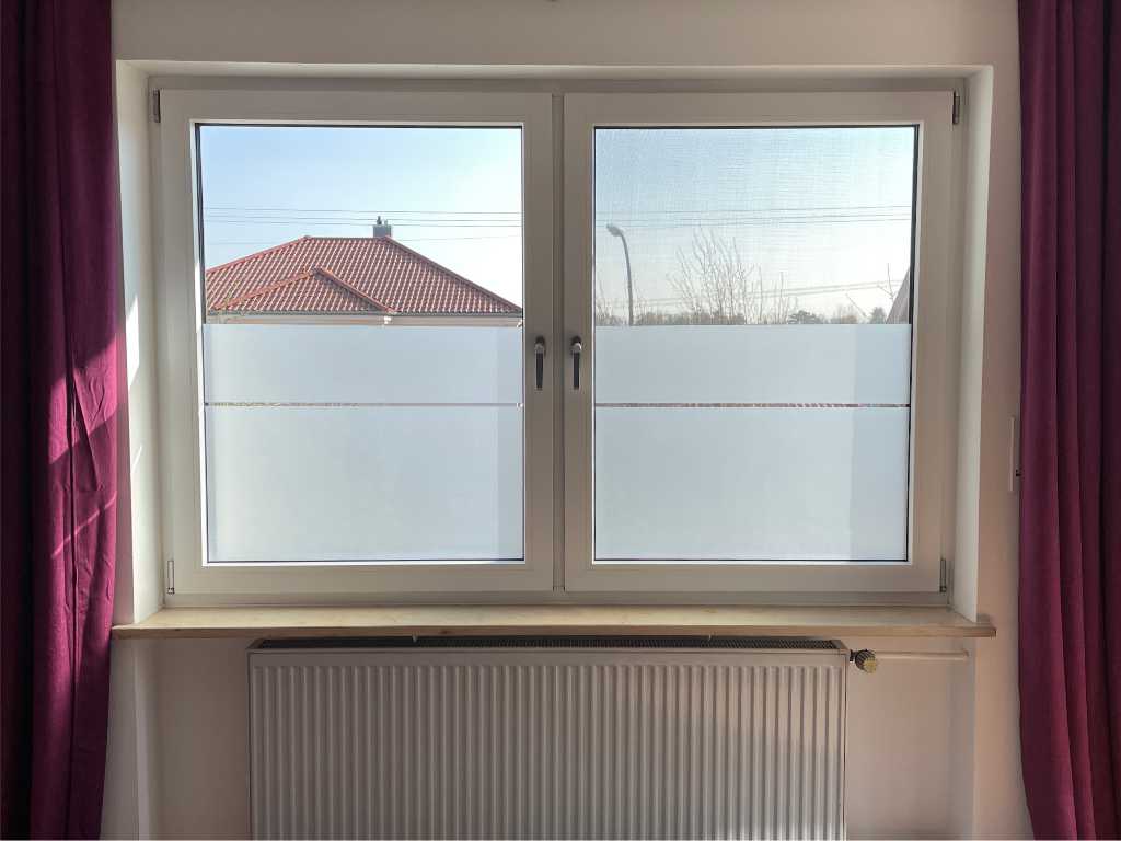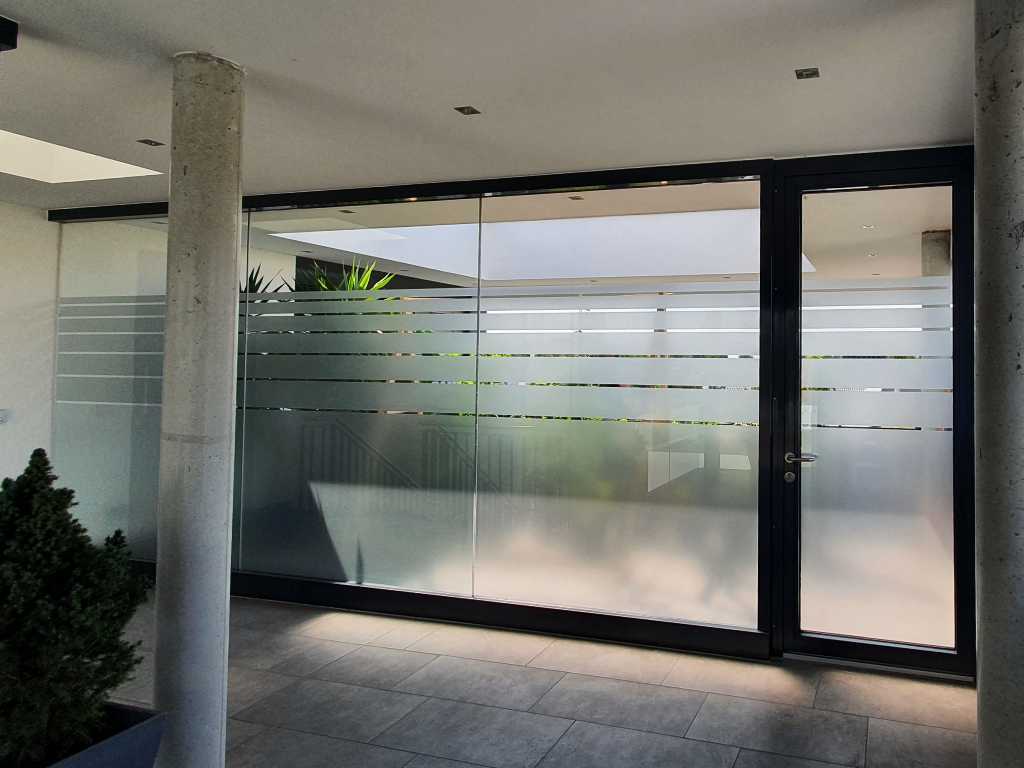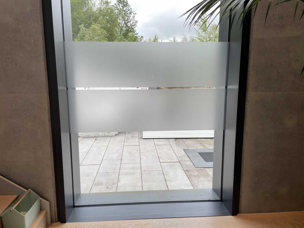 Vollflächige Sichtschutzfolie sorgt für zuverlässige Privatsphäre und ein gleichmäßig mattes Erscheinungsbild. Die Sichtschutzfolie bedeckt die gesamte Glasfläche, lässt Tageslicht hindurch, schützt jedoch vor UV-Strahlung und unerwünschten Einblicken.